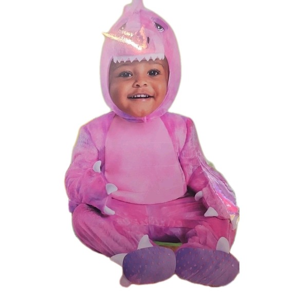 This listing is for a pre-owned Spirit pink Dino Halloween Costume. This costume is a child's infant size 6-12 months. This costume includes 2 pieces a jumpsuit with an attached tail. & hood. This costume is clean and complete. It has only been worn one time. Please see the pictures.