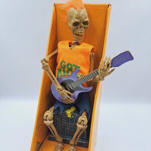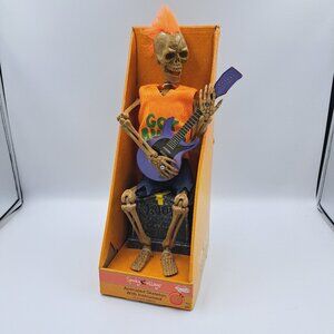New Spooky Village Animated Skeleton Playing Guitar With Orange Mohawk