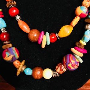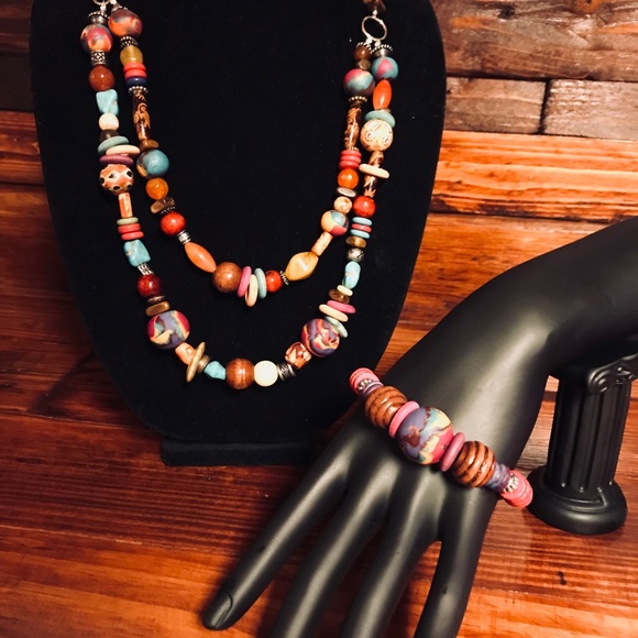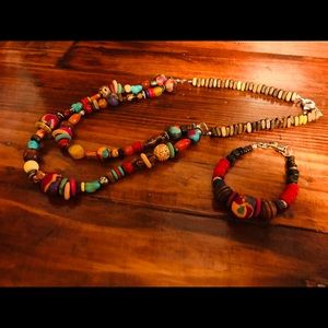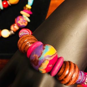 Beautiful wood and handmade/polished clay bead Statement necklace w/ bracelet. Multi colored.