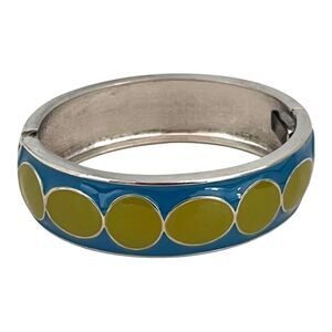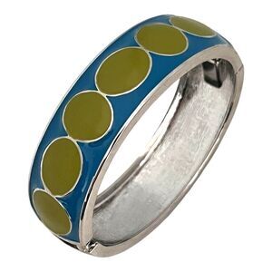 This design is silver tone and features blue and green enamel detailing It measures approximately 6.75 inches in circumference and .75 inch wide.