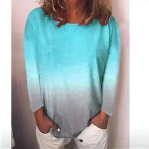 Women’s spring O-neck long sleeves, gradient color sheer T-shirt.