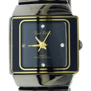 NEW Old Stock Women's FRED BELAY Quartz Watch, Shiny Black Band and Case and Dial, Metal Band, Water Resistant, Analog.