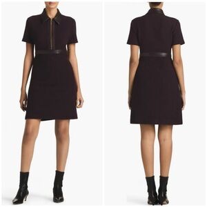A smooth jersey bodice offers textural counterpoint to the tweed skirt of this quarter-zip shirtdress trimmed with supple leather.