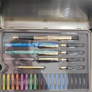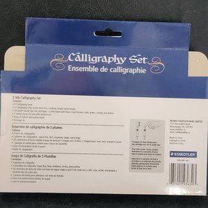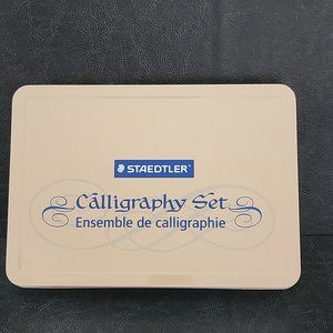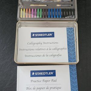 Staedtler Calligraphy 33 piece pin set. A complete set that is perfect for beginners. This set contains four beautiful pins with a faux marble finish and comfort grips. 5 nibs. Extra fine, fine, medium, broad and extra broad. 20 water based dye ink cartridges. (5 black,5 blue, 2 brown, 2 pink, 2 green, 2 orange and 2 yellow) One metal pump for use with bottled ink not included. Easy to follow instructions and a one by six and 1/2 by 9 1/4 inch metal tin for storage. Imported. Condition is new in sealed container. Non smoking pet free home.