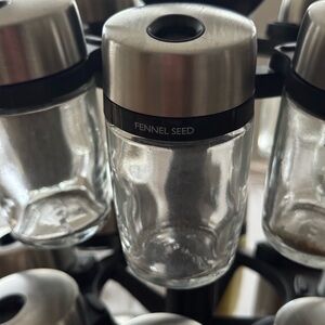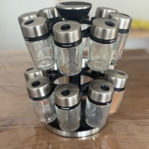 Elegant spice rack with stainless steel lids and clear glass jars. Perfect for organizing your kitchen. Never used. Came with spices but I removed them. Received as a wedding gift. Don’t have original box but will package it safely for delivery.