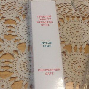 New stainless steel cocktail muddler. 8" in length. Nylon head, dishwasher safe bar accessory. Muddler is new in plastic but the top of box has a little tear, see last photo if gifting.