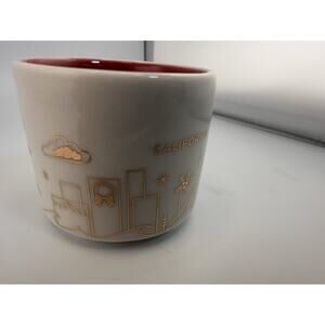 2 oz mini ceramic Starbucks California "You Are Here" Holiday Mini Mug Ornament. The design includes iconic California elements like a city skyline, mountains, palm trees, and holiday-themed items like a present.