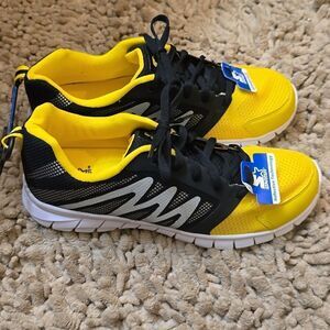 New with tags, women's size 6 Starter Sneaker yellow, with black accents, silver reflective sides for safety when jogging running or any other time you might need to be seen, lightweight, lace up, excellent condition