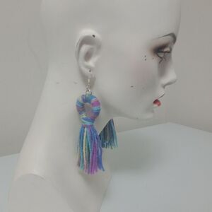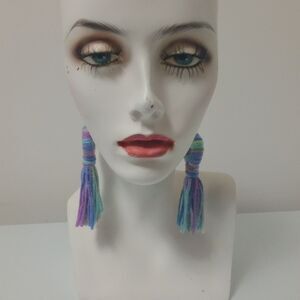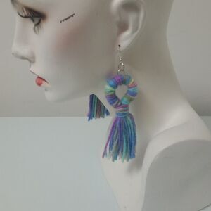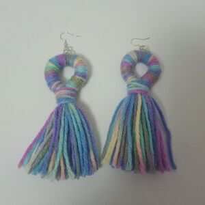 Add a fun and vibrant touch to your look with these handmade yarn tassel statement earrings. Featuring a unique looped design in soft pastel rainbow colors, these lightweight earrings measure approximately 4.25 inches long, making them the perfect accessory for festivals, parties, or everyday boho style. Comfortable fishhook backs make them easy to wear all day. Great for those who love one-of-a-kind, artistic jewelry pieces.