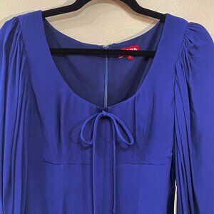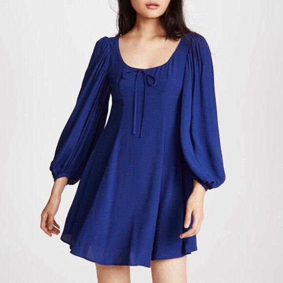 Staud Juniper mini dress featuring a scoop neck, decorative bow, full-length puff sleeves with button cuffs, empire waist seam, flared skirt, back zipper closure, slip lining, and a crepe textured viscose exterior in a pretty shade of deep cobalt blue called Boysenberry.