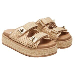 Raffia upper with gold-tone hardware and synthetic sole.