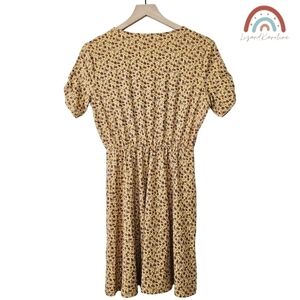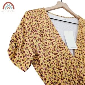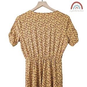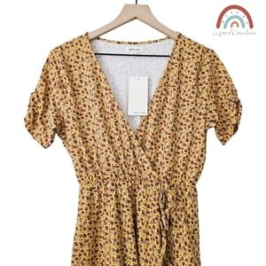 Stitch & Pine boho faux wrap yellow floral dress. Soft knit material, elastic waistband and ruched style short sleeves.