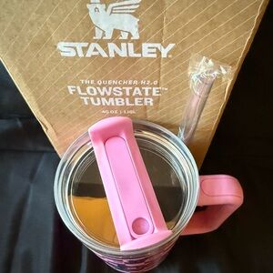 Stanley tumbler featuring a pink lid and handle. Includes a straw for easy sipping.