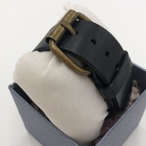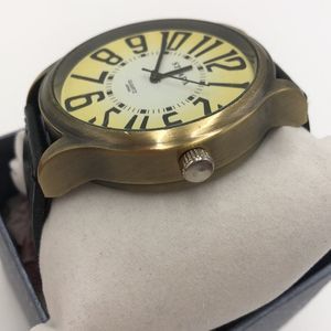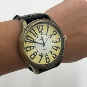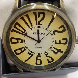 Brand new Strada wristwatch. Black faux leather band is 1” wide. Clock face is 1.75”, yellow, with easy to read black numbers. Comes in a gift box with a new battery.