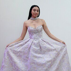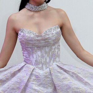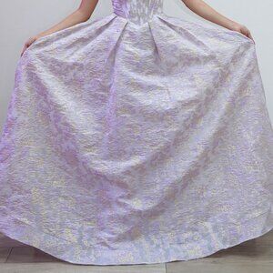 Crafted from luxurious jacquard, this semi-ball gown exudes refined elegance with its delicate floral print and pleated sweetheart neckline. The lace-up back ensures a perfect fit, while the matching choker adds a touch of regal sophistication. A timeless choice for those who favor poise and grace.