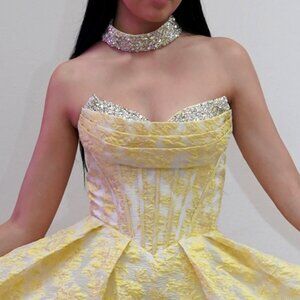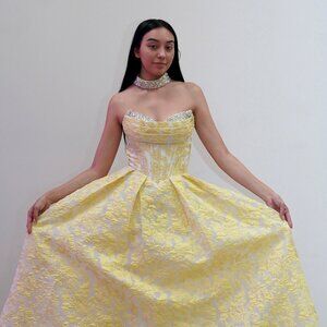 Crafted from luxurious jacquard, this semi-ball gown exudes refined elegance with its delicate floral print and pleated sweetheart neckline. The lace-up back ensures a perfect fit, while the matching choker adds a touch of regal sophistication. A timeless choice for those who favor poise and grace.