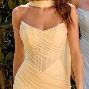 Features: Sheer boned bodice, matching scarf, gathered waistline