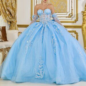 New Strapless Floral Lace Embellished Maxi Ball Gown w/ Sheer Sleeves DQ 5081
