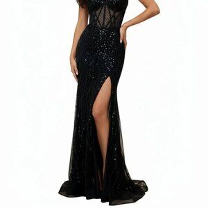 Turn heads in this dazzling long sheath gown, designed with a romantic sweetheart neckline and a sleek leg slit. Embellished with sequins, beads, and rhinestones, the sheer boned bodice adds a touch of bold elegance, making it perfect for glamorous evenings and special occasions.