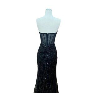 Turn heads in this dazzling long sheath gown, designed with a romantic sweetheart neckline and a sleek leg slit. Embellished with sequins, beads, and rhinestones, the sheer boned bodice adds a touch of bold elegance, making it perfect for glamorous evenings and special occasions.