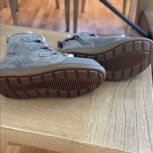 Cozy and stylish boots for kids. Gray exterior with purple laces. Ideal for winter fun. No box.