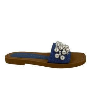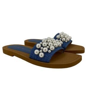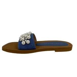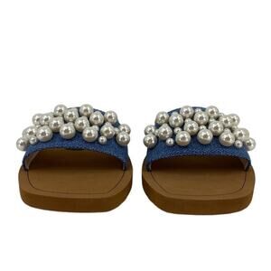 New Stuart Weitzman Goldie Pearl Embellished Slide Sandals in Denim Size 7.5