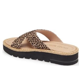 Braided jute trim brings espadrille-inspired style to a cross-strap sandal lifted by a wedge platform with scalloped treads.