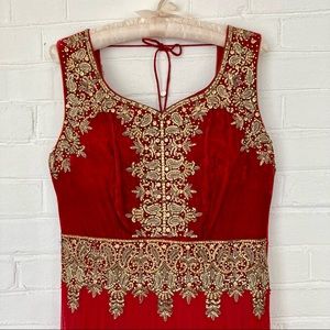 STUNNING Red Gown on velvet & net fabrics. Brand new! Perfect for Indian weddings & events. Gold stone & thread detailing contrasts stunningly on red velvet bodice & net skirt. Side zip. Could expand/alter as needed - some give on side. Ideal for Size 2, maybe size 4.