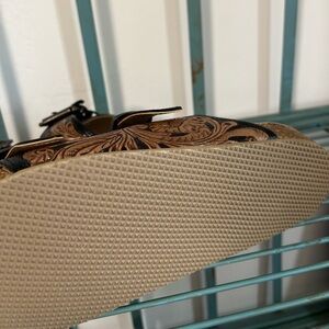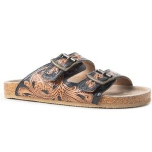 Step into boho-Western elegance with these hand-tooled leather sandals. Featuring delicate silver feather accents and antique buckle details on a cork footbed, these adjustable slides merge free-spirited style with everyday comfort. Perfect for the modern wanderer