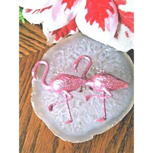 These adorable and unique earrings are handmade and each earring features an acrylic bright pink flamingo with sparkly glitter.