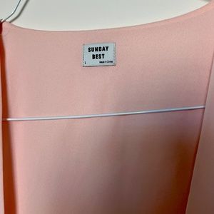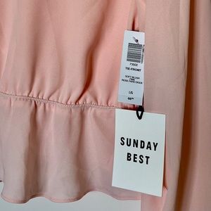 New Sunday Best Long Sleeve Blouse in a light pink color. This is a size Large. It is a long sleeve blouse that has never been worn - it is new with tags. There is a clasp in the front to close the top and strings to tie a bow. It is perfect over a cami or a cute corset bra for going out and pairs well with jeans. Feel free to purchase as is or make an offer. No trades please. Thanks🌺