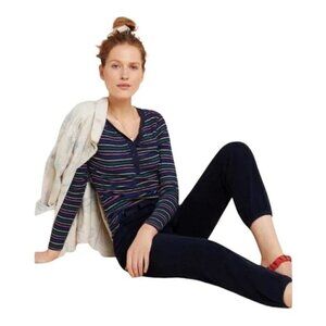 New With Tag Sundry Navy Rainbow Stripe Henley V Neck Long Sleeve Top with raw hem