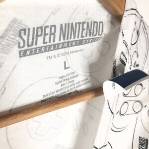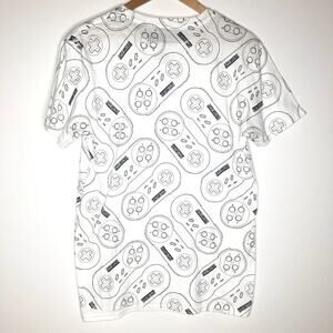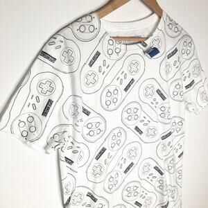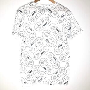 New with tag white Super Nintendo t-shirt with black outlined SNES controllers all over print. Men's size large but looks to be a slim fit and would probably also fit a medium. Check measurements if unsure!