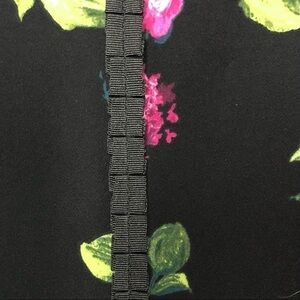Susan Graver Printed Stretch Woven Jacket. In the color Black/Berry. All over floral print. Long sleeves. Jacket is lined. Pleated ribbon trim along placket with hook-and-eye closure.