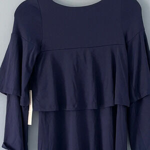 Susan Monoco Navy Dress with tiered ruffles at sleeves and chest. Size Small. New with tags!