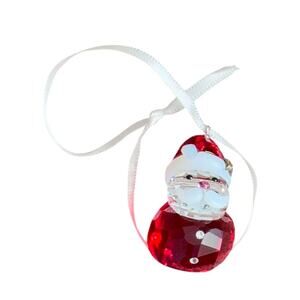 New in Box Swarovski Rocking Santa Claus Ornament. Dangling cheerfully on a white satin ribbon, this portly little figurine in red and clear sparkling crystal brings joy and cheer with 316 shining facets. Loving crystal details like his pink nose and the star on his hat complete the design. This colorful companion will complement any festive decoration set or make for a cheerful gift.