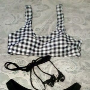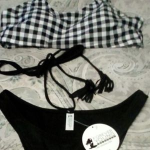 Forever Young High cut bottoms with lightly padded gingham tank swim top. Runs small. Im a 36 B, 27, 35. This fits slightly snug on me.