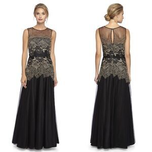 New! TAHARI ASL Women's Floral Embroidered Illusion Gown Black Gold Sleeveless