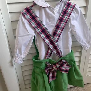 Brand new, never worn Beaufort Bonnet Company green corduroy skirt with plaid straps and matching long sleeve onesie both 12-18 months. Purchased when my daughter was born but ended up being too small when the holidays came around and I had already cut the tags.