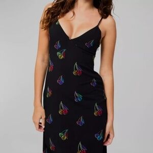 New TEREZ Halftone Cherry Print V-Neck Spaghetti Straps Black Maxi Dress NWT