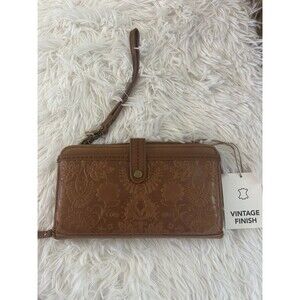 New THE SAK Brown Wallet Large Smartphone Leather Tobacco Floral Embossed