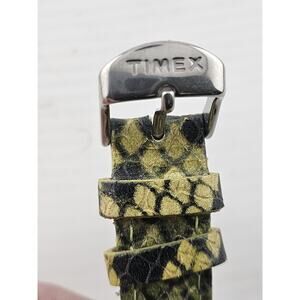 Check out this NOS Timex Green Python mens watch. As you can see, from the pictures it has a very interesting leather band which resembles python skin. This iconic timepiece was produced in 2012 and is likely different than any watch you own. It does have a dependable and durable quartz movement like many watches but is more eye-catching and cool than most watches and won't break the bank. Just look at the pictures and imagine wearing that! It has a new battery and is keeping time accurately.