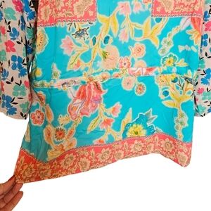 New TOLANI Vittoria Aqua Floral 3/4 Sleeve Boho Tie Waist Hankerchief Hem Blouse