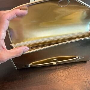 New without tags, TORY BURCH Kira Gold Metallic Leather Envelope Logo Clutch Handbag Evening Bag MSRP: $475