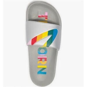 A rainbow logo print adorns easy-wear slide sandals with a comfortable contoured footbed.
