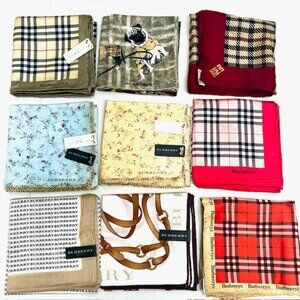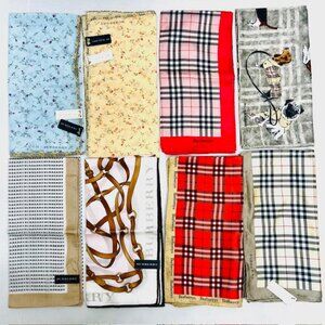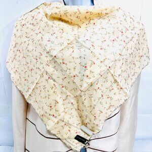 #52) New Tag on Burberry Miniscarf/handkerchief 23"x23", cotton and silk, light peach yellow red floral with nova trim, made in Japan