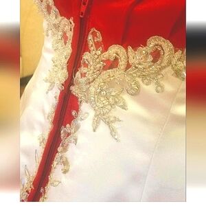 Stunning gown featuring a vibrant red bodice and elegant white skirt. Intricate silver embroidery adds a touch of luxury.