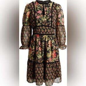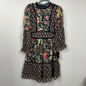 New Tahari ASL Floral Long Sleeve Chiffon Dress Mini Boho Church Spring Sz 4