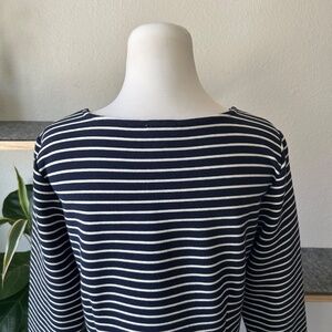 New Talbots White Navy Straps 79%Cotton 16% Polyester Long Sleeve Dress size 8P. Pit to pit 18.5”, sleeve length 17.5”, waist width 17”, hips 21”, total length 35.5”. In excellent condition, new without tag.