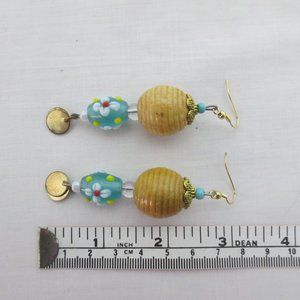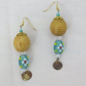 New Tan Wood Blue Floral Lampwork Glass Earrings